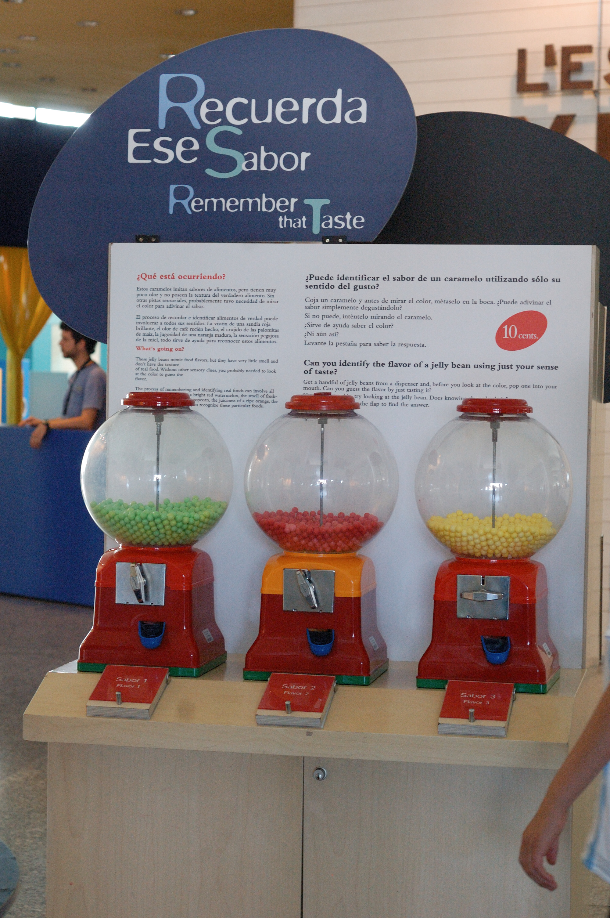 En la línea de lo que algunos museos desarrollan en sus áreas paraexpositivas a modo de prolongación por goteo del espacio de la tienda -tipo “mete un centavo por la ranura y, previo pago, la máquina le grabará la efigie de un dinosaurio”- el Museo de las Ciencias Príncipe Felipe ha ido más allá introduciendo el insert coin en su exposición permanente. En la foto podéis ver cómo uno de los manipulables retaba al visitante a experimentar el desacuerdo de sus sentidos –desafiando la asimilación de colores con sabores– previo pago de 10 céntimos por bola de chicle consumida. Con tres sabores presentados, el coste de la experiencia ascendía a 30 céntimos por cabeza. Sin dinero de por medio el manipulable resultaba completamente inútil. Por si alguno piensa que 30 céntimos es una cantidad ínfima y coherente con el precio de mercado de las mismas bolas de chicle en el mundo exterior diré que el problema no